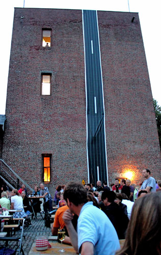 Gemeint ist die "Straße des Lebens", eine ca. 75 m lange Textilbahn, die auf dem Burghof beginnend den Turm hinauf und um 90 Grad gedreht den Turm wieder herunter verlief.