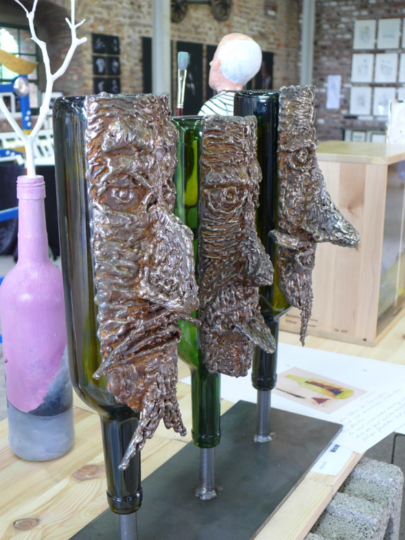 Teile der Gruppenarbeit „Glasflasche“  Fotograf Jochen Rüskens (links) und sein Abendmahl  Flaschenmasken von Willi Arlt  Teile der Gruppenarbeit „Glasflasche“